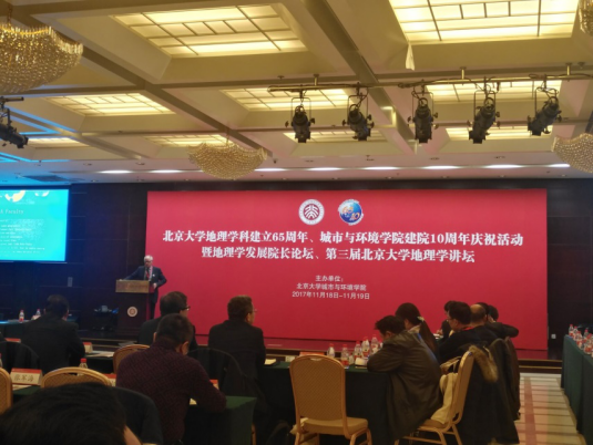 11月18日-19日,北京大学地理学科建立65周年-城市与环境学院建院10周年庆祝活动暨地理学发展院长论坛、第三届北京大学地理学讲坛在北京大学中关新园•群英宴会厅隆重举行。参加会议嘉宾有陆大道院士(中国地理学会原理事长)、傅伯杰院士(中国地理学会理事长)、Anthony Yeh院士(香港大学城市规划及环境管理学院院长)、龚健雅院士(武汉大学遥感信息工程学院院长、中国测绘学会副会长)、张国友教授(中国地理学会副理事长)、葛全胜研究员(中国科学院地理科学与资源研究所所长)、林初昇教授(香港大学社会科学院副院长)、林桢家教授(台湾大学地理环境资源学系主任)、Eric Sheppard教授(加利福尼亚大学洛杉矶分校)等来自两岸三地和海内外的300余专家学者参加了此次系列学术交流与庆祝活动。