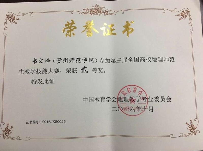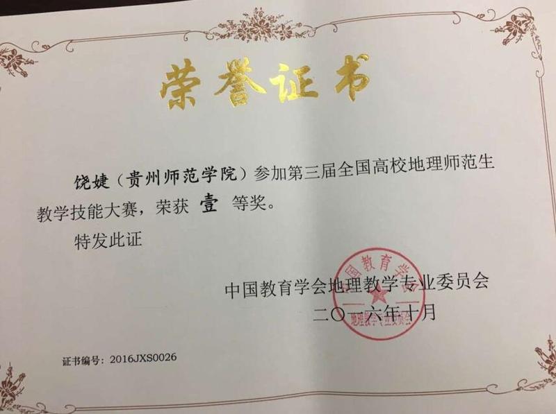 2016年10月12日,第三届全国高校地理师范生“中教启星杯”教学技能大赛在云南师范大学举行,365官网地理与旅游学院教师郑建带领2013级地理科学专业学生饶婕、韦文峰参加了比赛,饶婕荣获一等奖,韦文峰荣获二等奖。