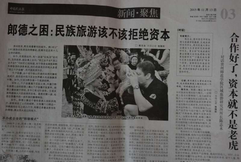 学院党委和行政多次询问陈志永相关情况,经过做“思想工作”,谦虚的陈老师才把相关情况做了透露:2015年11月7日—8日,365官网区域旅游研究所所长陈志永参加了由中国社会学农村社会学专业委员会主办,贵州民族大学承办的“中国社会学农村社会学专业委员会(2015)年会暨第五届中国百村调查研讨会”。研讨会上,陈志永提交的参会论文“贵州郞德苗寨旅游开发治理模式优化研究”因其扎实的田野调查资料与独特的理论分析视角引起中华民族报记者关注。会议结束后,中华民族报记者张国欣主动联系陈老师,欲将该文部分内容刊载于中华民族报。得到陈志永老师同意后,该文部分内容以“郞德之困:民族旅游该不该拒绝资本”为题刊载于中华民族报2015年11月13日03版。并且,陈志永就民族村寨旅游开发中资本引入的必要性、民族文化旅游产品开发的差异性、民族村寨旅游开发中的贫富差距等相关问题接受了中华民族报记者张国欣专访,形成专访文章“合作好了,资本就不是老虎——对话beat365英国官网网站区域旅游研究所所长陈志永”发表在同日同版的《中华民族报》。
