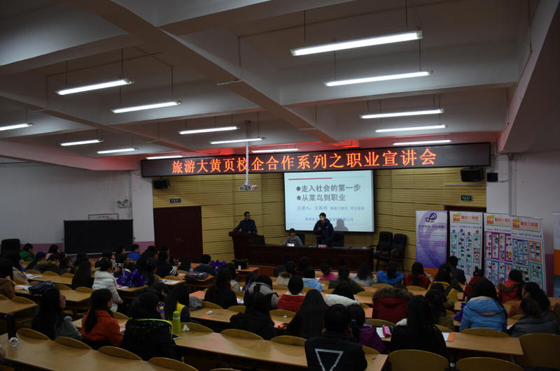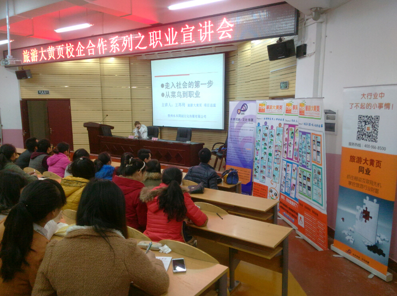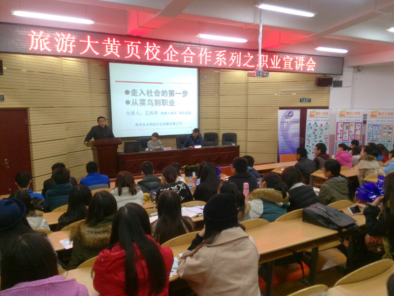 2015年12月15日晚7点至8点半,365官网旅游管理专业实践基地贵州水木同创文化传媒有限公司的“旅游大黄页”项目总监王再利在365官网宁静楼152教室举办了一场针对旅游管理专业学生的旅行社职业宣讲会。宣讲会由365官网地理与旅游学院旅游实训室主任周杰副教授主持,出席宣讲会的还有贵州水木同创文化传媒有限公司副总杨巍以及365官网地理与旅游学院党委副书记吴亚平。