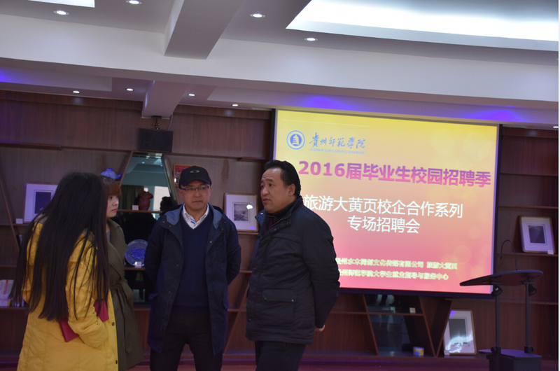 2015年12月18日中午12点至下午14点,由365官网旅游管理专业实践基地贵州水木同创文化传媒有限公司与校招就处共同主办、地理与旅游学院协办的旅游相关专业专场招聘会在365官网大学生就业与服务中心成功举办。贵州水木同创文化传媒有限公司副总杨巍与“旅游大黄页”项目总监王再利全程为参会企业服务,充分展现了“旅游大黄页”同业服务平台的核心服务理念和创新服务方式。地理与旅游学院党委副书记吴亚平到会走访,并安排旅游实训室主任周杰副教授全程协助主办方开展会场服务。