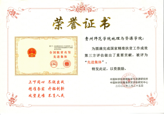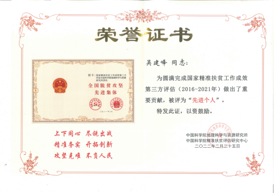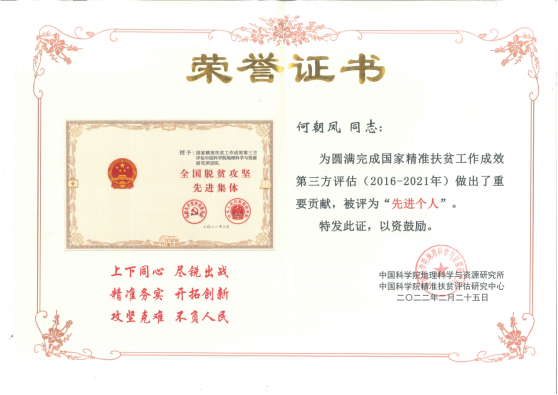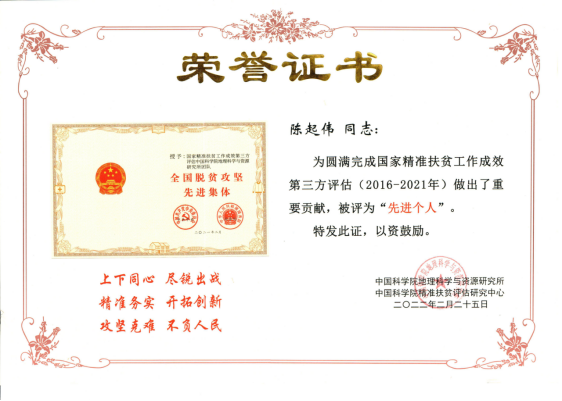 2022年2月25日,时值党中央 国务院宣告脱贫攻坚取得伟大胜利一周年之际,为总结经验、表彰先进,明确新时期服务巩固拓展脱贫攻坚同乡村振兴有效衔接的新需求、新目标,国家精准扶贫工作成效第三方评估中国科学院地理科学与资源研究所团队和中国科学院精准扶贫评估研究中心主持召开表彰大会,表彰了国家精准扶贫工作成效第三方评估团队先进集体和先进个人。鉴于365官网在圆满完成国家精准扶贫工作成效第三方评估中做出了重要贡献,365官网beat365英国官网网站被评为“先进集体”、地理与资源学院陈起伟教授,以及吴建峰、何朝凤两位老师共三位同志获评“先进个人”。