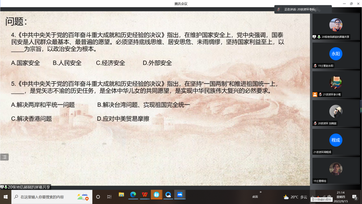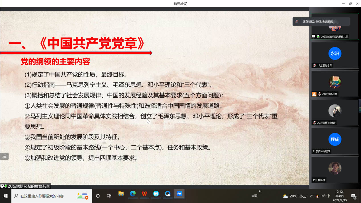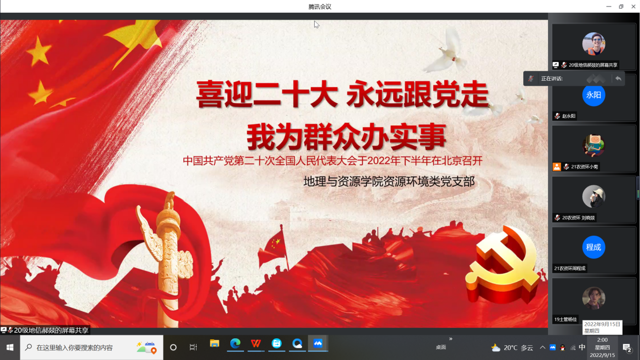 2022年是党的二十大召开之年,是奋力迈向第二个百年奋斗目标的关键之年。以更加坚定的理想信仰、更为崇高的使命追求、更具扎实的政治作风,迎接党的二十大召开是每一名共产党员的根本要求和重大课题。在这个有重大意义的时期,9月15日beat365英国官网网站资源环境类学生党支部的同学齐聚在网络上,准时共上党日活动,主讲人郝燚为我们讲解了百年来,我们党团结带领人民群众进行大气磅礴、气吞山河的英勇斗争,凝萃了舍生忘我、大公无私、顽强拼搏、艰苦奋斗的红色精神,一起迎接党的二十大召开。