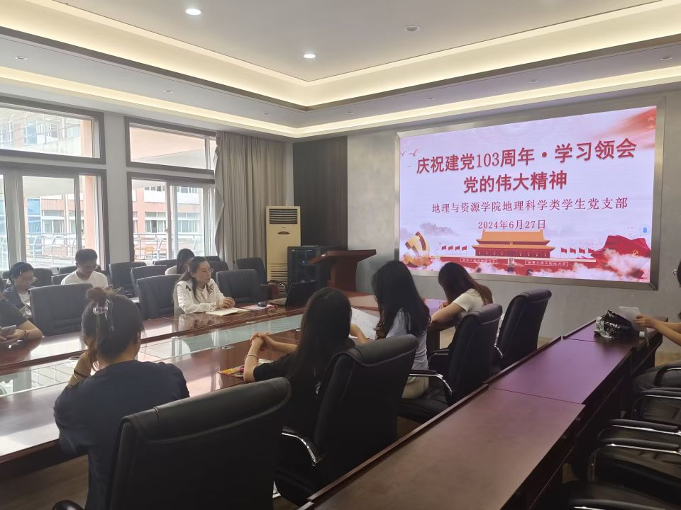 为隆重庆祝中国共产党成立103周年,进一步学习和领会党的伟大精神,深化对党的历史认识,激发爱国情怀。2024年6月27日,beat365英国官网网站地理科学类学生党支部在宁静楼323会议室开展了“庆祝建党103周年·学习领会党的伟大精神”主题活动。