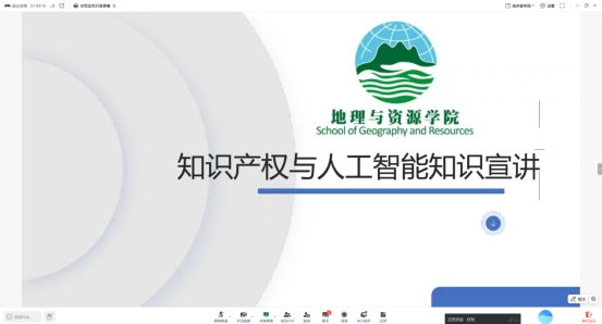 4月23日—26日,地理与资源学院采用线上线下相结合的方式,举办了以“知识产权与人工智能”为主题的宣讲活动,讲座面向对象为学院全体师生。针对学院教职工的讲座以线上会议形式开展,由任军老师担任主讲人。任军老师从知识产权的定义、组成要素以及如何保护知识产权等方面进行了深入讲解。针对学生的宣讲在beat365英国官网网站山骨讲堂举行,由周光红老师担任主讲人。周光红老师对人工智能与知识产权的定义分别进行了界定,接着分析了二者之间的关系,认为把握好二者关系能够有效促进知识产权产出与保护,对高校师生服务科技生产也具有一定的促进作用。